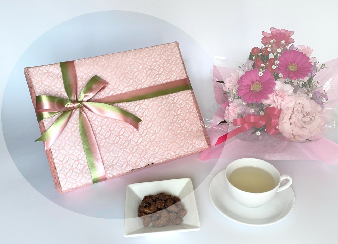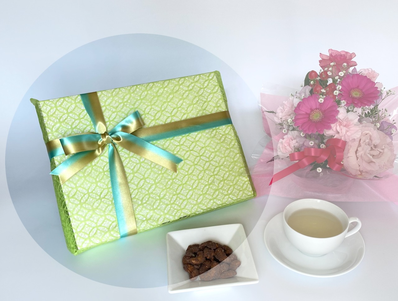 紙製ボックス(【ボックス+リボン】のボックスをご確認ください)を七宝透かし柄の包装紙で包み、リボンをおかけいたします。商品数2点または3点用です。